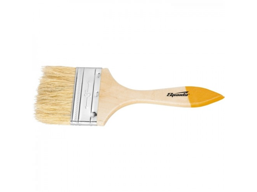 Ворс кисти из натуральной щетины одинарной выварки. Щетина расщеплена на концах. Толщина кисти от 6 до 9 мм. Щетина кисти надежно закреплена металлическим бандажом с антикоррозийным покрытием. Деревянная ручка утолщена в зоне охвата. Кисть предназначена для работ с масляными красками и лаками. Недорогой продукт, используется для несложных малярных работ.