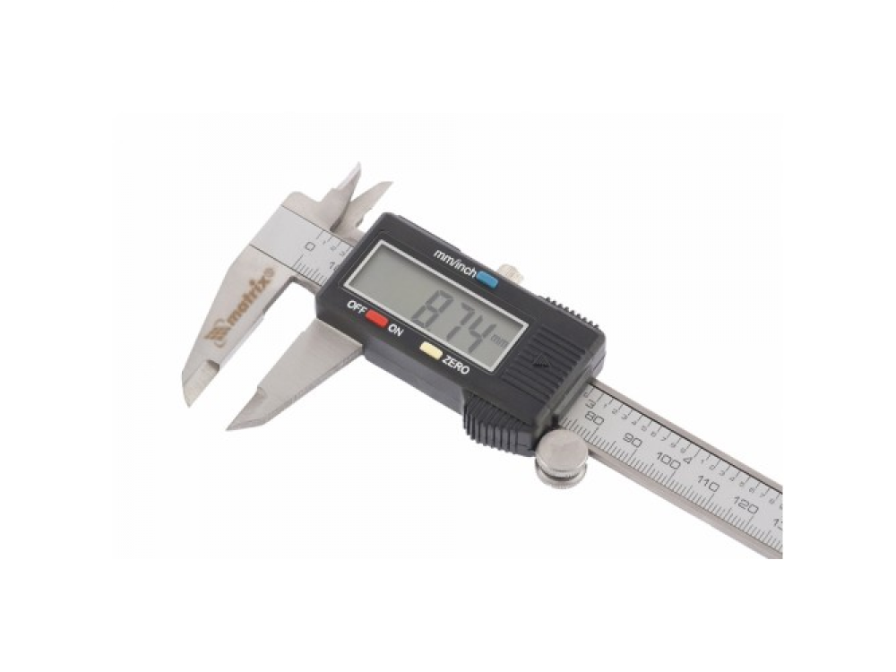 Штангенциркуль изготовлен из инструментальной нержавеющей стали. При перемещении бегунка по профилю инструмента показания измерений отражаются на жидкокристаллическом дисплее. Источник питания – одна батарея 1,5 В, тип SR44. Погрешность измерения 0,02 мм (