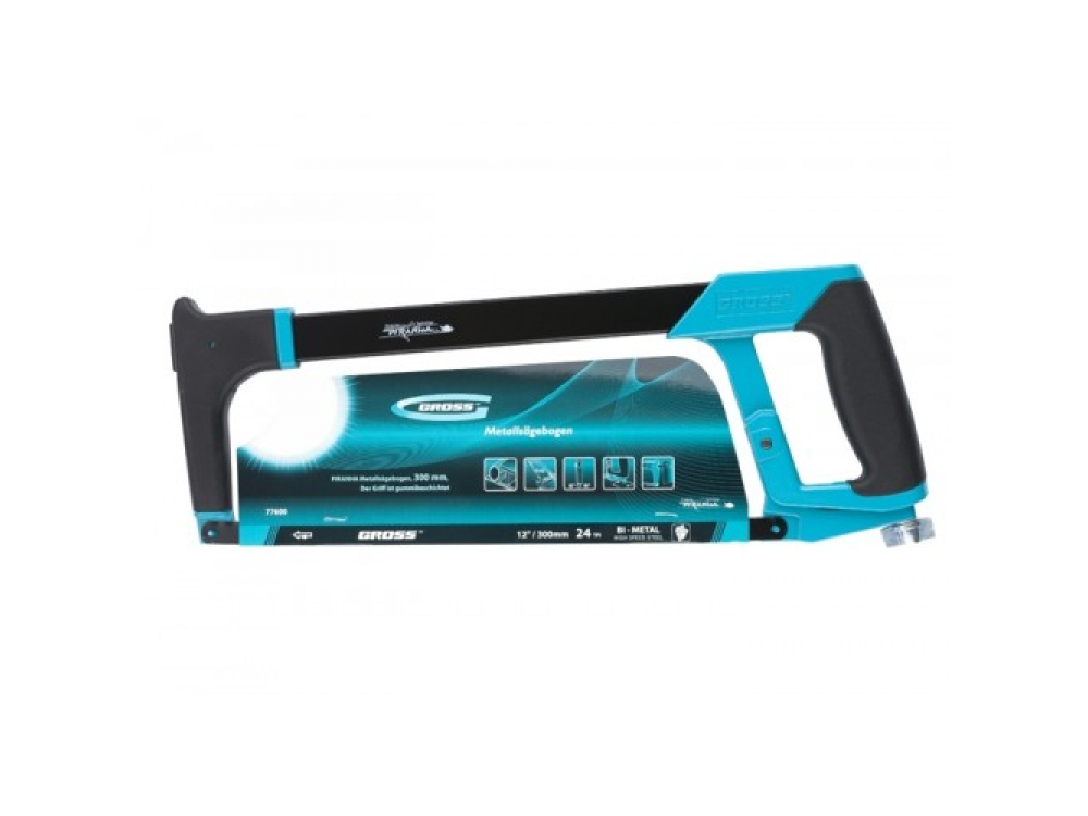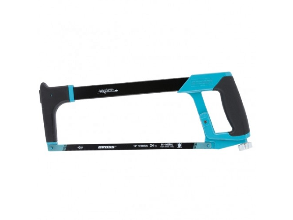 Ножовка по металлу "PIRANHA" торговой марки GROSS изготовлена из прочного алюминиевого сплава. Поверхность ножовки покрыта дополнительным слоем эмали, который защищает металл от воздействия окружающей среды. Обрезиненная рукоятка удобно и надежно фиксируется в руке, тем самым повышая эффективность инструмента в работе. Рычажно-винтовой механизм натяжения полотна расположен непосредственно под рукояткой. Усилие, с которым можно зафиксировать полотно, составляет 170 KGF, что позволяет эффективно контролировать давление полотна на заготовку и обеспечивает прямой, точный и ровный пропил. Ножовка комплектуется биметаллическим полотном. Длина полотна 300 мм, шаг зуба 24 TPI (24 зуба на дюйм, 1 дюйм = 2,54 см). Конструкция ножовочной рамки позволяет устанавливать полотно под углом 45° и 90°.